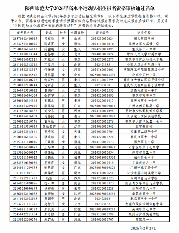 陕西师范大学2026年高水平运动队招生报名资格审核通过名单